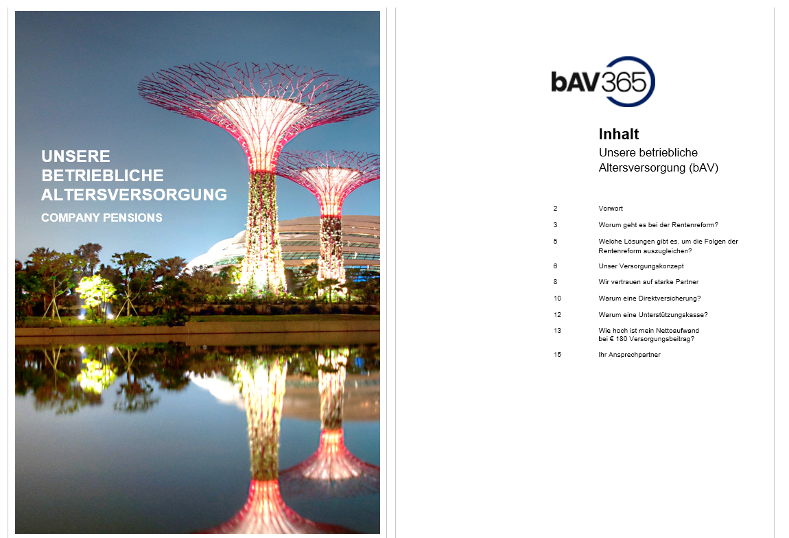 Für Ihre Mitarbeiterkommunikation stellen wir die Broschüre „Unsere betriebliche Altersversorgung“ zur Verfügung. Das komplexe Thema wird erläutert und mit konkreten Umwandlungsbeispielen verdeutlicht. Die Professionalität Ihres Auftrittes als Arbeitgeber wird erhöht und gleichzeitig werden die ersten Fragen beantwortet. Für Neueinstellungen ist diese Broschüre sehr geeignet. Das individuellem Design wird entsprechend Ihrer CI erstellt.